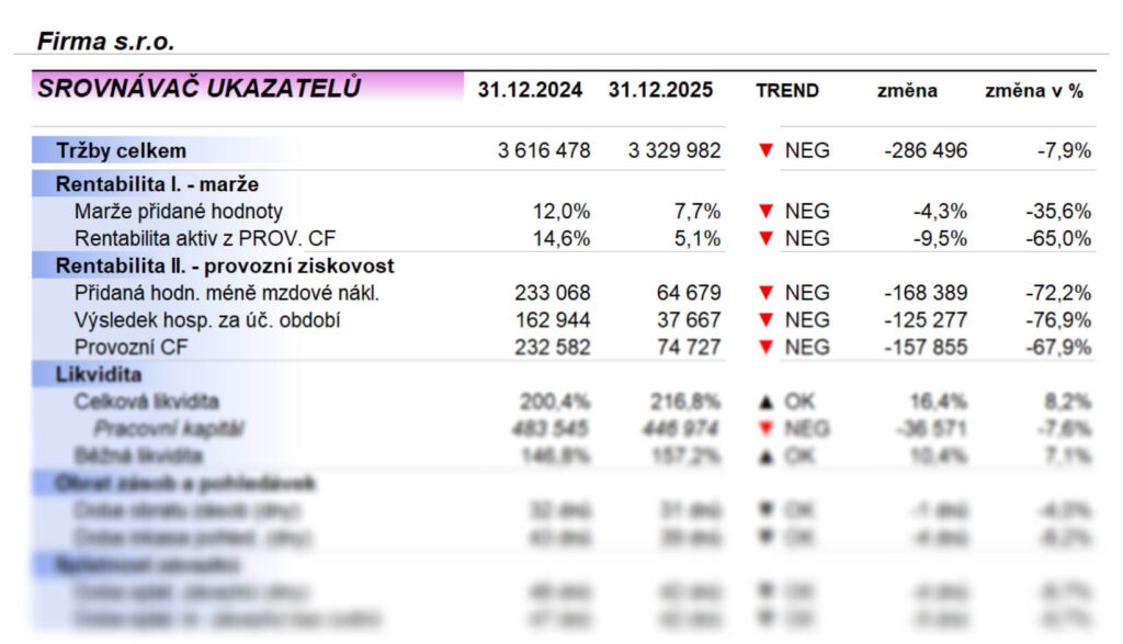 Finanční analýza s programem FAF automaticky porovná vývoj firmy v čase a upozorní na rizikové oblasti.